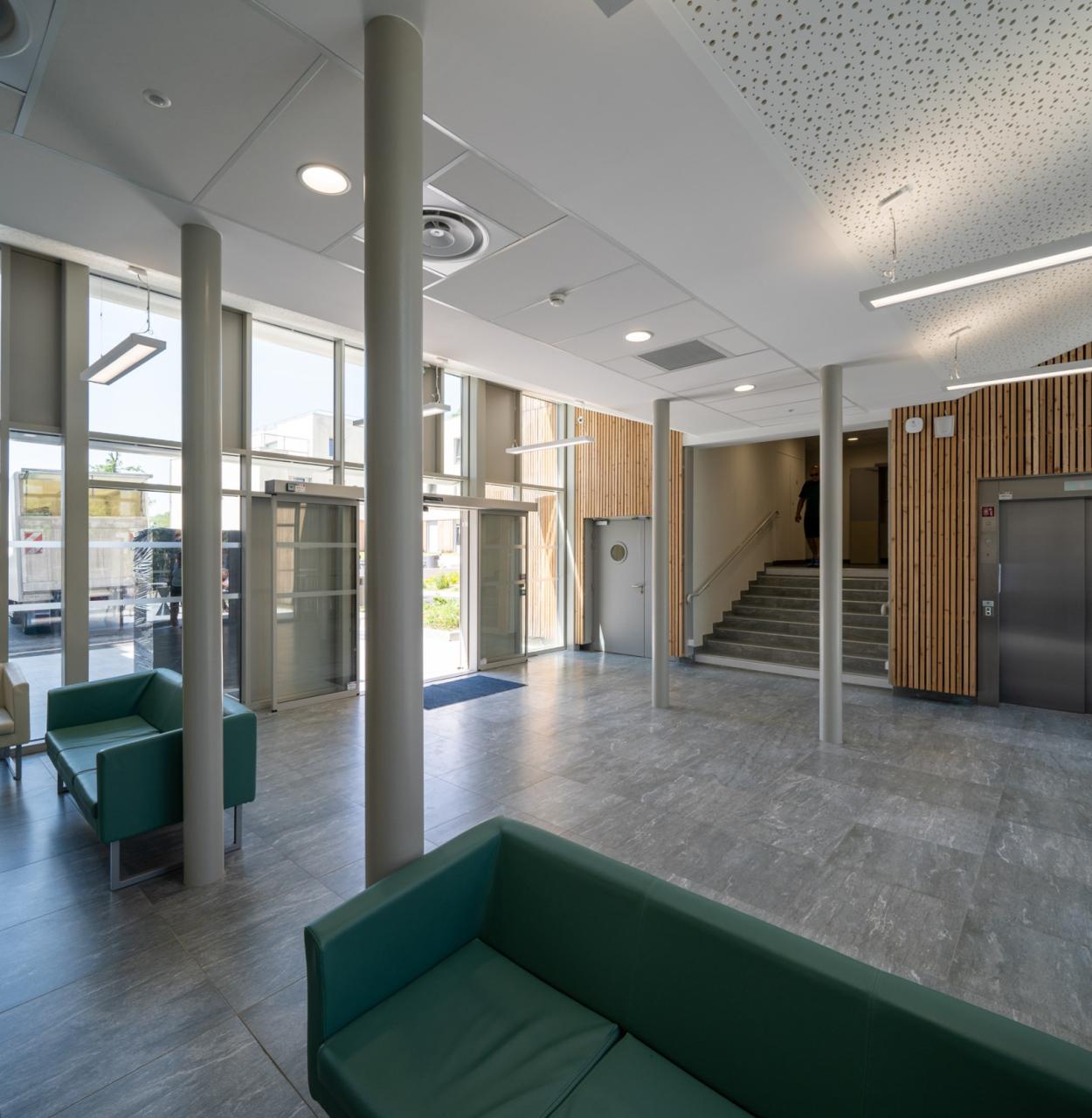 The two new buildings are positioned alongside a early 20th-century château, which underwent extensive restructuring while remaining operational. The château houses the reception functions and offices.