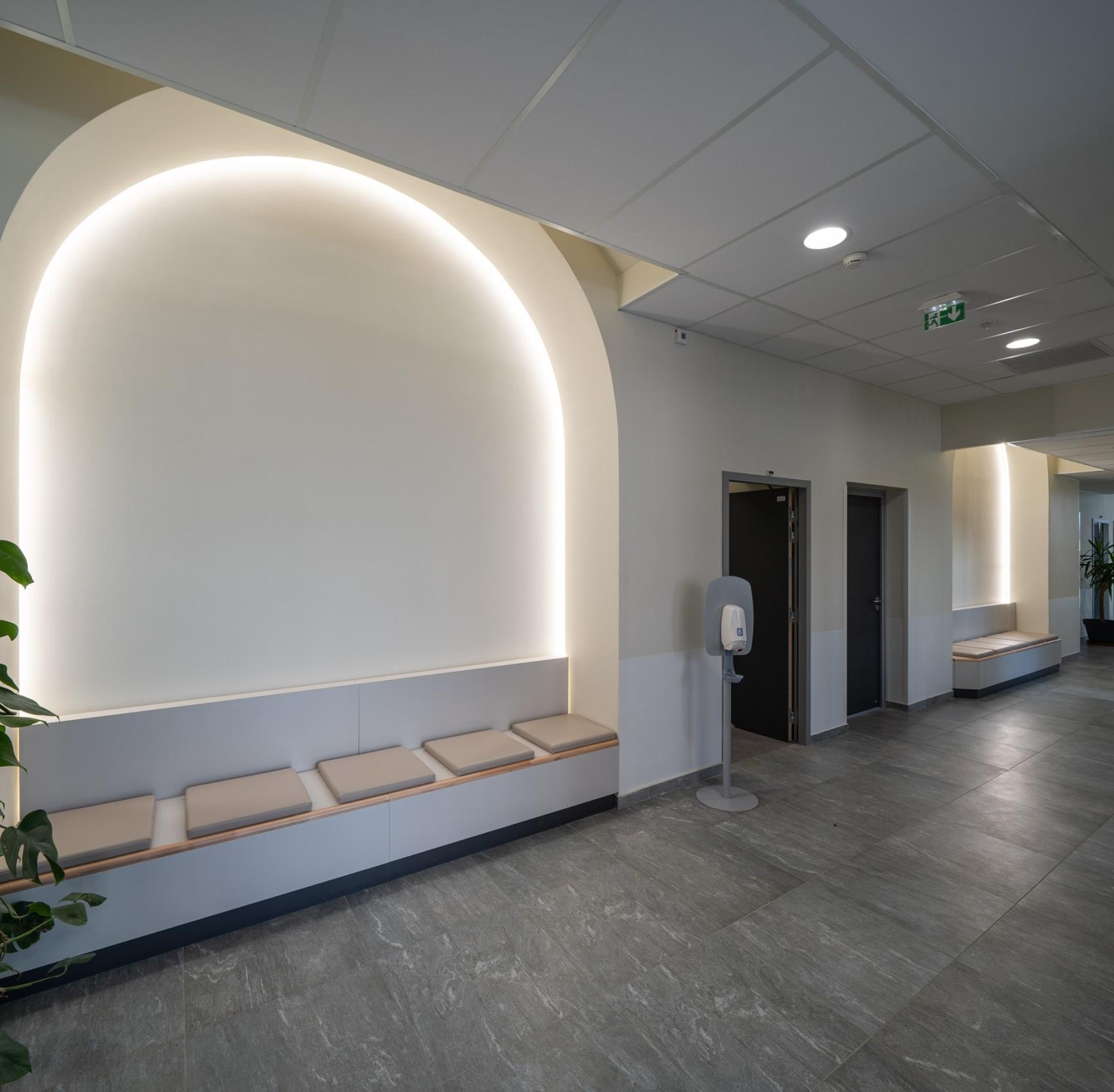 This extension and restructuring project brings together two mental health clinics on the same site, with a total of 230 inpatient beds, a geriatric unit, a day center, and a hydrotherapy space. The building is arranged in a U-shape around the château, creating a large open landscaped area.