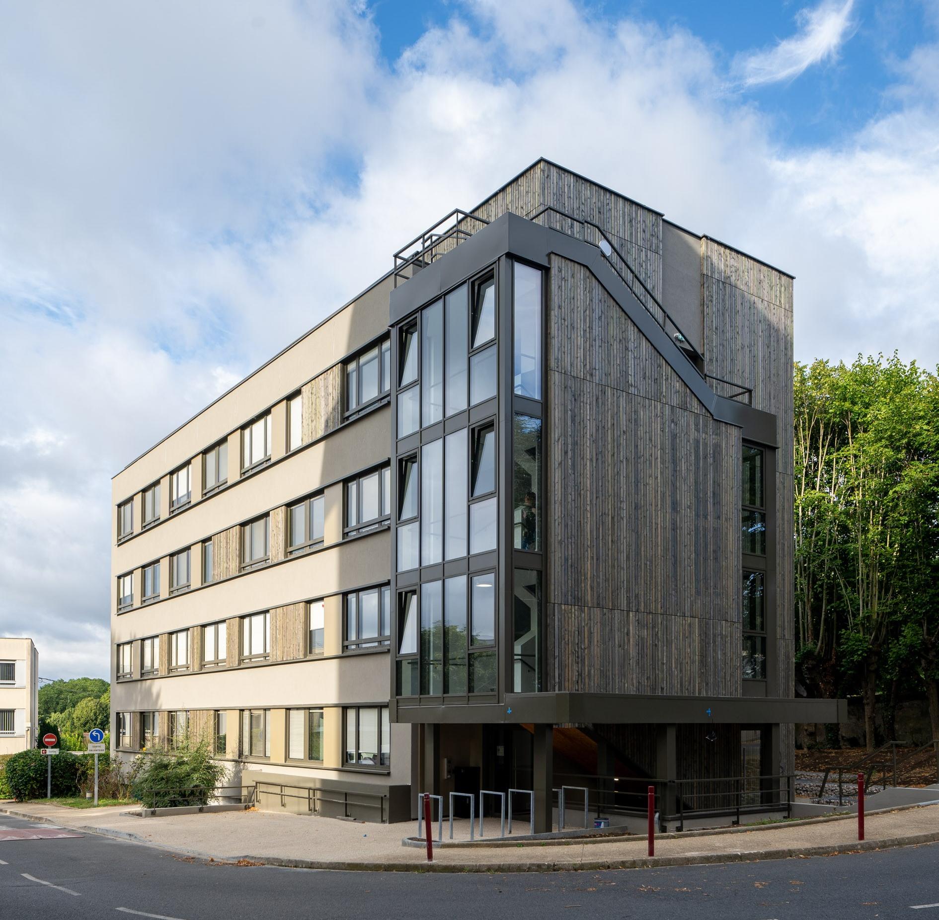 This new facility replaces three existing structures in the sector. With three floors, 160 individual rooms, and two units for Alzheimer’s patients, the Montereau nursing home also features a large dining hall with terraces and ground-floor commercial spaces.